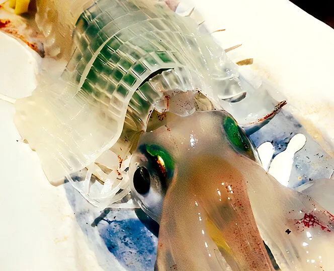 長浜市場の鮮魚や、平戸から直送される新鮮なイカの生き造りは必食。